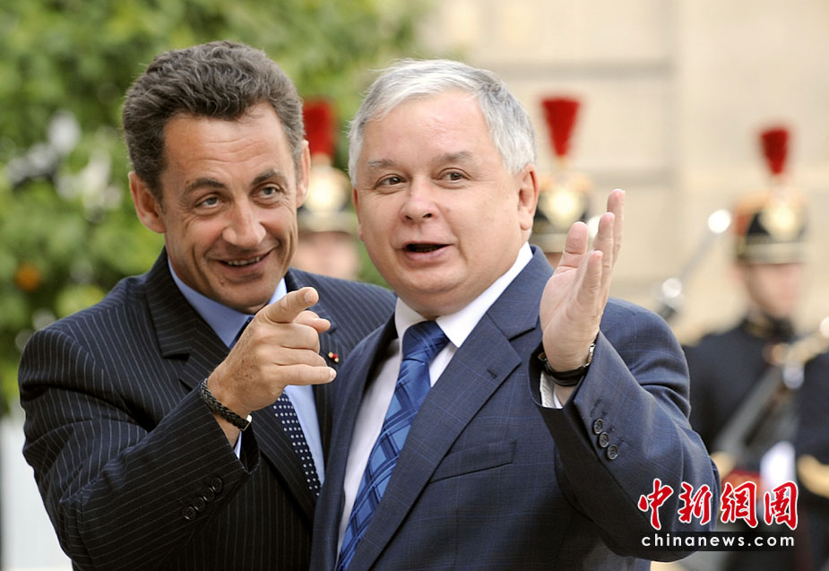 波蘭總統卡欽斯基乘坐的一架圖-154飛機10日在俄羅斯斯摩棱斯克州北部一軍用機場降落時失事,至少87人死亡。卡欽斯基本人被確認身亡。圖為2007年波蘭總統卡欽斯基與法國總統薩科奇。