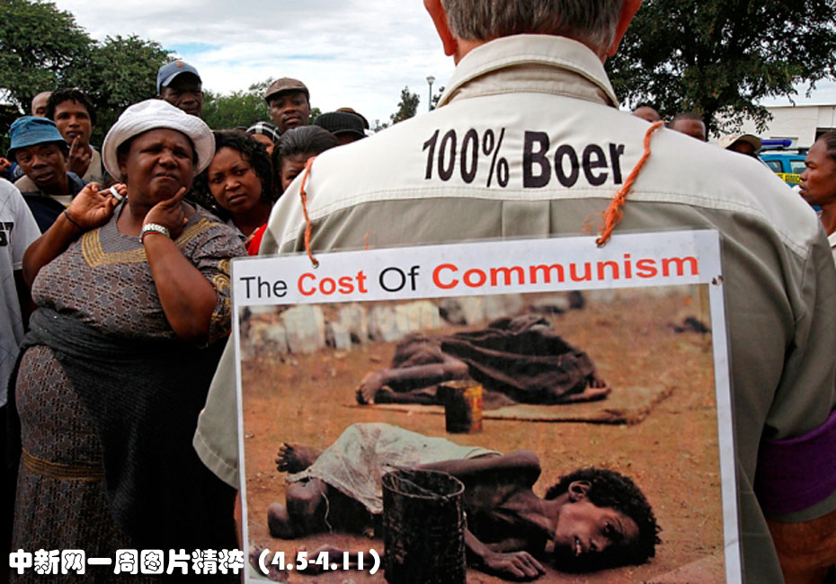 4月6日周二,在南非小鎮文特斯多,被害“白人至上”領導人尤金•特雷布蘭奇的一名支持者(圖右,背對鏡頭者)站在法院門外對人群講話。