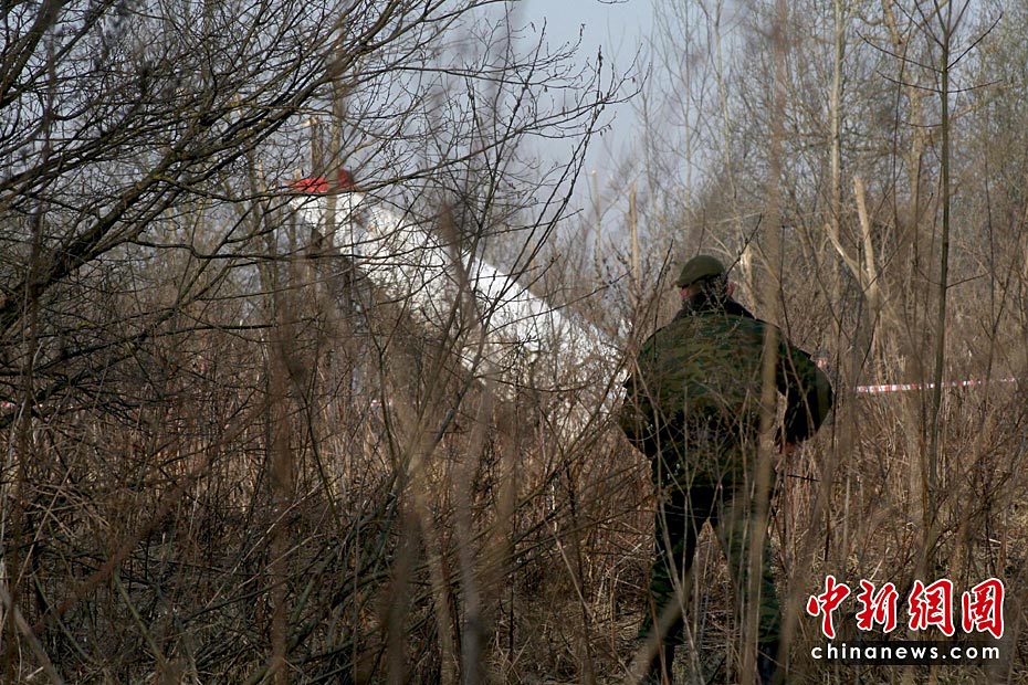 4月11日,波蘭總統卡欽斯基專機在俄羅斯斯摩棱斯克軍用機場墜毀地點附近的道路開通,但是警戒線核心區仍然關閉。俄波調查人員正在現場工作。圖片來源:中國新聞網