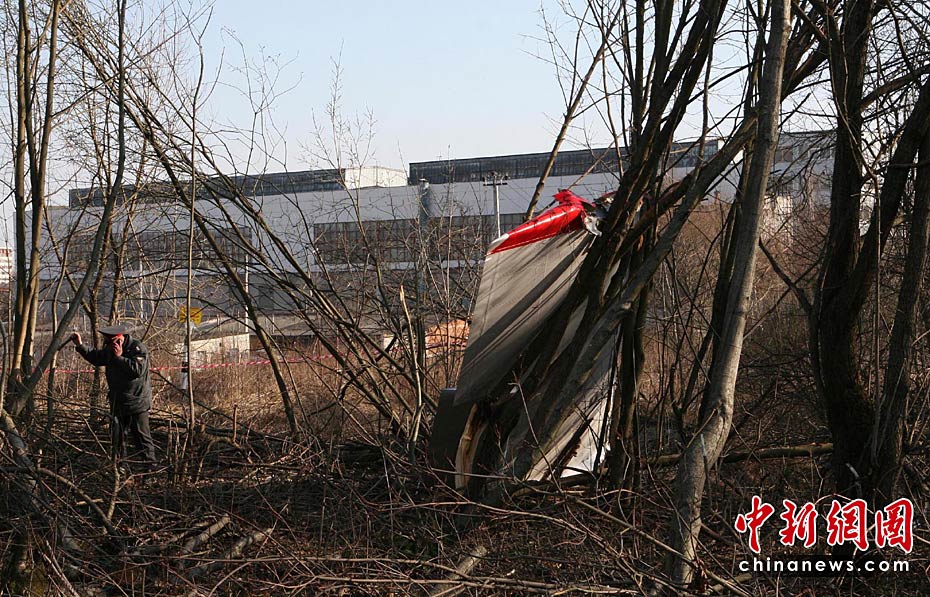 4月11日,波蘭總統卡欽斯基專機在俄羅斯斯摩棱斯克軍用機場墜毀地點附近的道路開通,但是警戒線核心區仍然關閉。俄波調查人員正在現場工作。圖片來源:中國新聞網