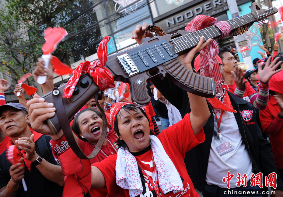當地時間4月12日,泰國紅衫軍在曼谷市區抬著棺材舉行游行,借此向政府施壓促阿披實下臺。此前紅衫軍示威者與軍警發生沖突,造成21人死亡。圖片來源:中國新聞網