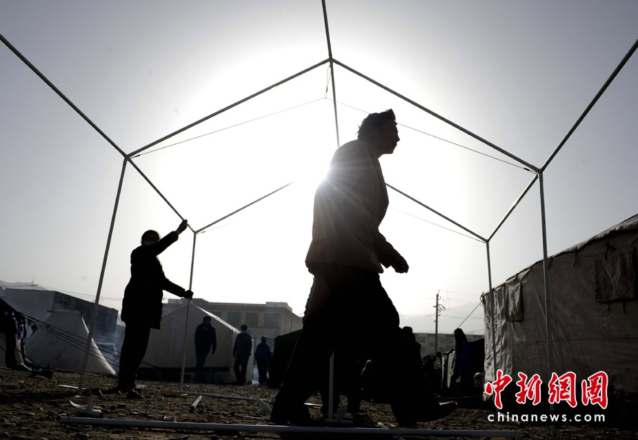 4月15日,青海玉樹縣體育場的地震災民安置點內,玉樹地震災民正在積極自建抗震帳棚。中新社發(fā) 廖攀 攝