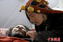 4月16日,青海玉樹震區僧侶們在廢墟邊為地震遇難者按藏族習俗進行超度。中新社發 孫自法 攝