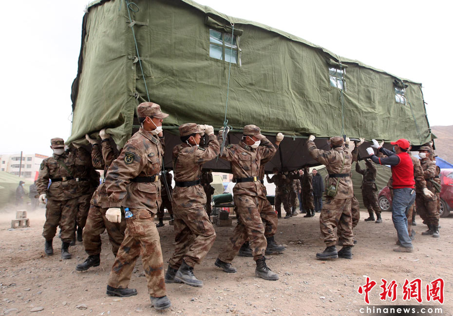 4月17日,青海玉樹體育場受災民眾安置點內,解放軍救援隊為安置點整體搬遷帳篷。中新社發 盛佳鵬 攝