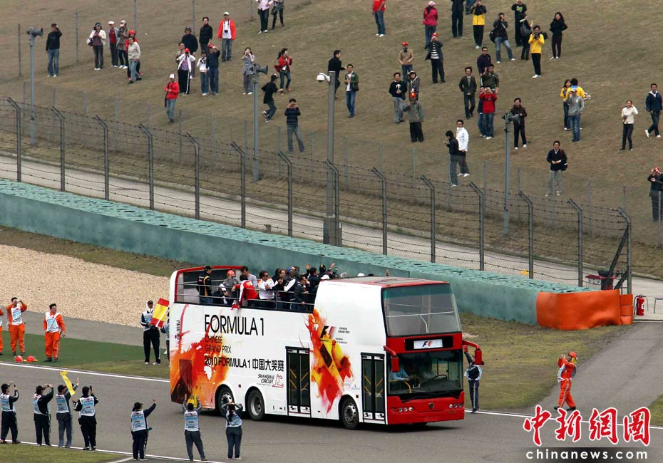 4月18日下午,2010國際汽聯(lián)F1世界錦標(biāo)賽上海站在上海國際賽車場舉行正式比賽,賽前24名參賽車手按照慣例乘坐敞篷車環(huán)繞賽場一周與車迷見面,但是寥寥無幾的觀眾與陰沉的天氣使上海F1賽事創(chuàng)下開賽七年以來觀眾人數(shù)最低的紀(jì)錄。中新社記者 任晨鳴 攝