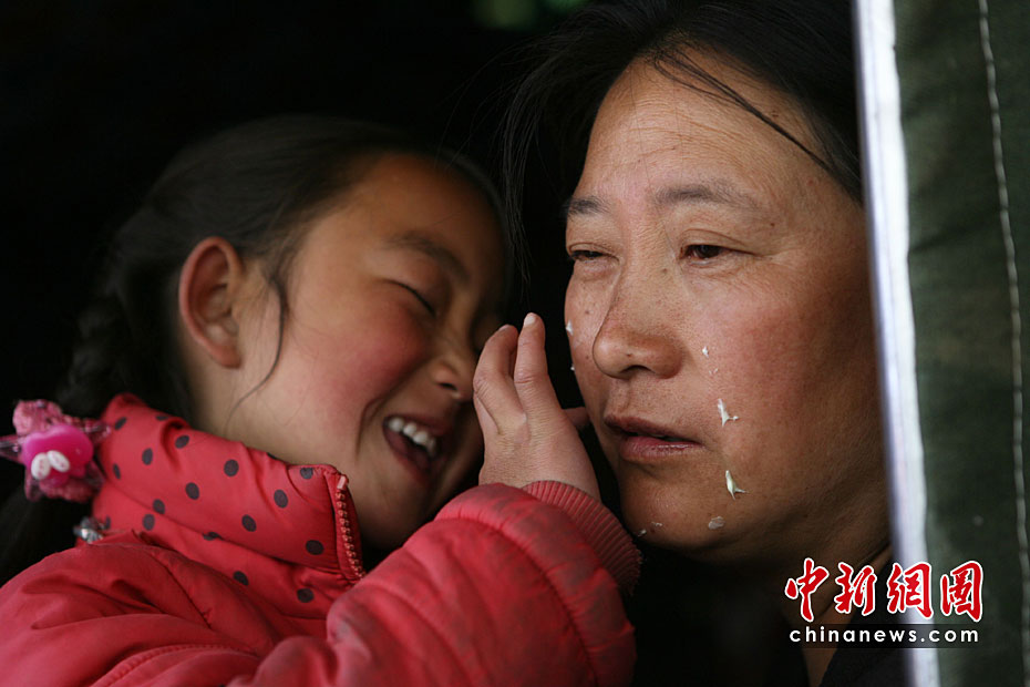 4月20日,青海省玉樹縣結(jié)古鎮(zhèn)紅旗小學一年級學生羅菁瑜在臨時帳篷里為媽媽涂雪花膏。他的爸爸出門到家中倒塌的廢墟里去尋找衣服等可用的物品。中新社發(fā) 蘇丹 攝