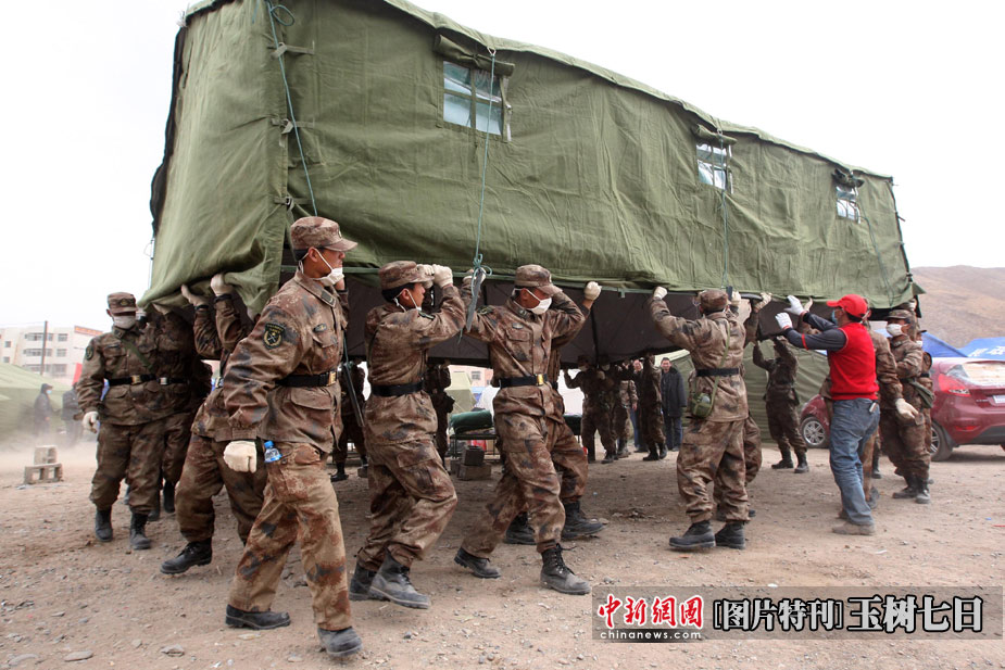 4月17日,青海玉樹體育場受災(zāi)民眾安置點內(nèi),解放軍救援隊為安置點整體搬遷帳篷。中新社發(fā) 盛佳鵬 攝