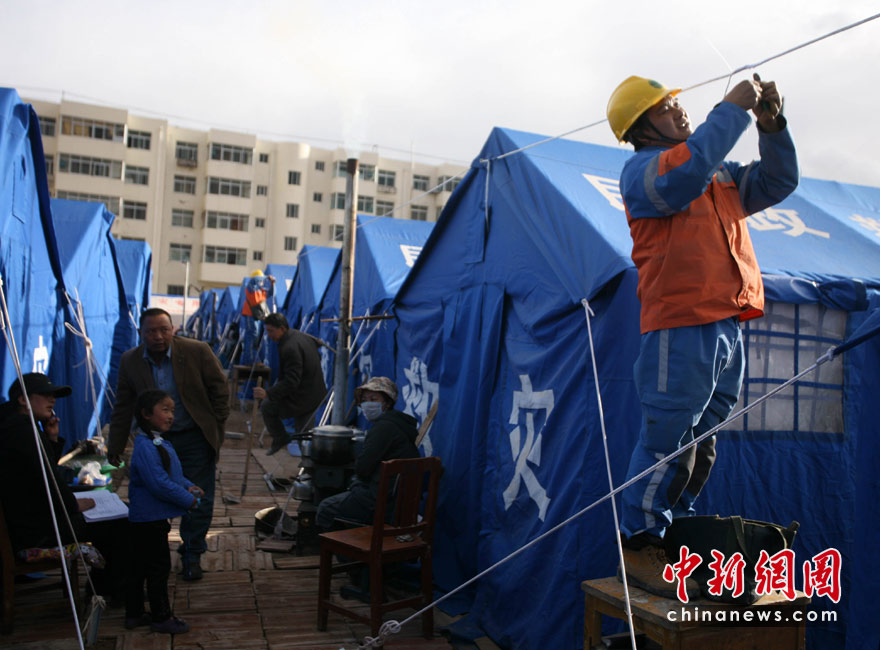 4月20日,國家電網四川公司抗震救災突擊隊經過辛苦工作,青海玉樹紅旗小學正式恢復供電。這是玉樹第一所恢復供電的學校。圖為來自四川的電力技術人員正在為40頂帳篷牽線接燈。中新社發 劉忠俊 攝