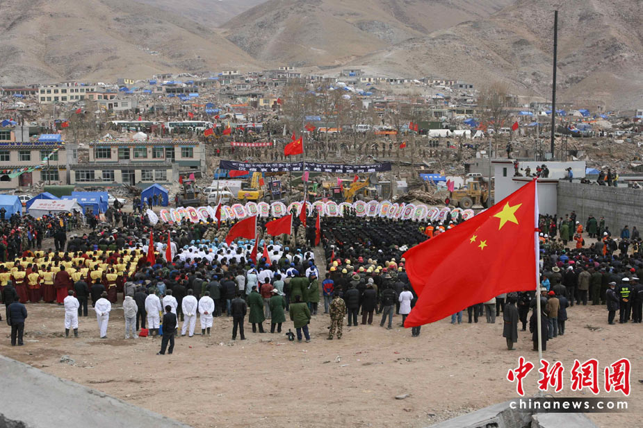 4月21日,為表達全國各族人民對青海玉樹地震遇難同胞的深切哀悼,中國國務院決定,舉行全國哀悼活動。圖為青海玉樹當地民眾在玉樹縣結古鎮(zhèn)鎮(zhèn)政府舉行哀悼活動。中新社發(fā) 蘇丹 攝