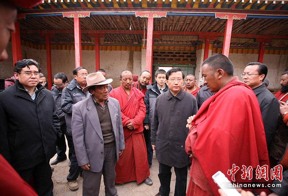 4月21日,青海省委書記強衛來到玉樹縣結古鎮結古寺,親切看望慰問受災僧侶,并詳細了解了結古寺受災情,強衛對寺管會在地震發生后參與抗震救災給予了高度評價。中新社發 劉忠俊 攝