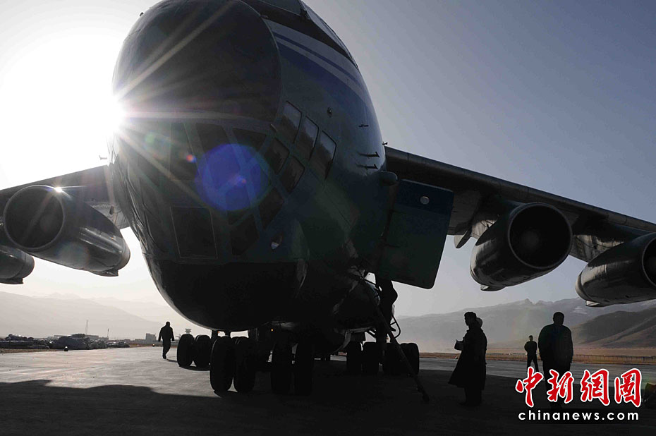 4月18日清晨6時 (賈國榮)天蒙蒙亮,中新社和中新網從北京增援采訪青海玉樹7.1級強烈地震的記者組,趕赴到成都某空軍機場,搭乘中國空軍伊爾-76重型運輸機037機群呼嘯起飛。