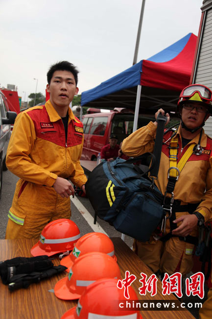 4月26日,臺灣“北二高”基隆段山崩斷橋意外第2天,大批工程人員使用近50臺怪手持續(xù)開挖,但尚未尋獲被埋的車輛和失蹤者。這起“走山”斷橋意外發(fā)生在25日,一座高百米的山坡全然崩坍,土石覆蓋道路長約200米、面積達(dá)3個足球場之大,令南下北上的交通大受影響。 圖為特種搜救隊(duì)員在現(xiàn)場待命。 董會峰 攝