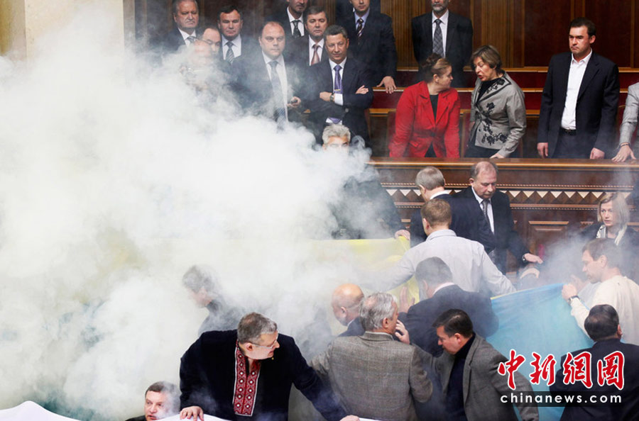 4月27日,基輔,烏克蘭議會(huì)就俄羅斯黑海艦隊(duì)駐扎問題進(jìn)行討論時(shí)出現(xiàn)混亂,數(shù)千人在議會(huì)外示威,會(huì)場內(nèi)有人投擲煙霧彈和雞蛋,大廳內(nèi)煙霧彌漫,場面一度混亂。