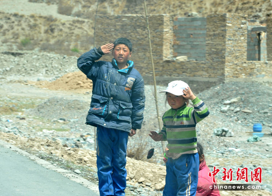 各地赴青海地震救援隊伍4月底前陸續撤回,玉樹通往西寧的214國道路邊,經?梢娪行W生向回撤的抗震救災車隊人員舉手致敬。中新社發 賈國榮 攝