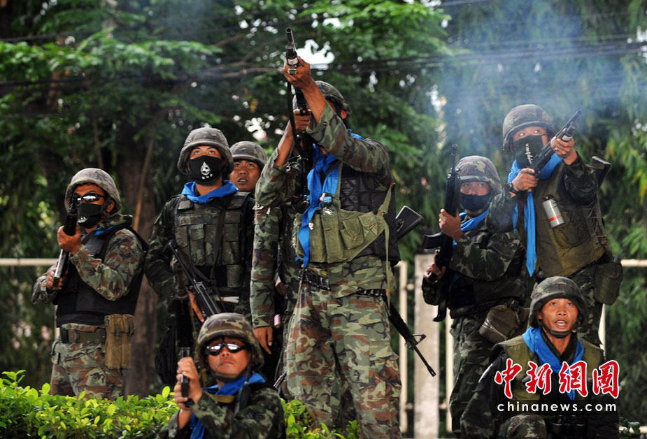 泰國防暴警察與紅衫軍示威民眾28日下午爆發沖突,1名士兵頭部被擊中身受重傷,10名示威民眾受傷送醫。