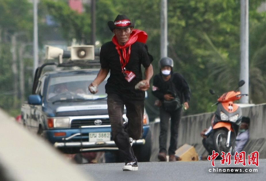 泰國防暴警察與紅衫軍示威民眾28日下午爆發沖突,1名士兵頭部被擊中身受重傷,10名示威民眾受傷送醫。