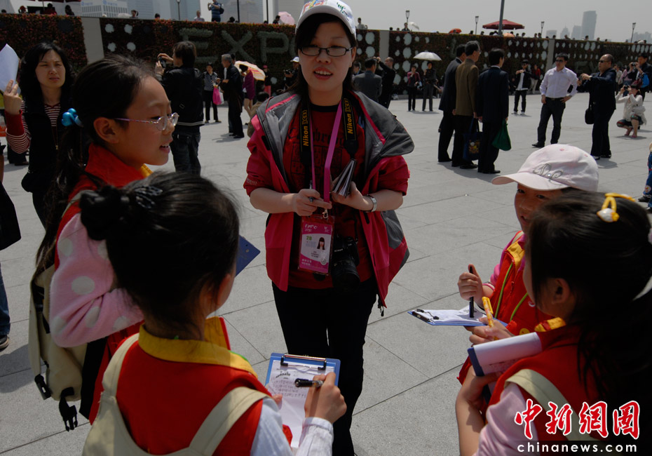 30日上午,記者在上海外灘采訪時遇到小主人報新聞學(xué)校的“小記者”們在采訪,成為他們今天的第一個采訪對象。“小記者”們最關(guān)心的問題是關(guān)于世博會,“如何讓世界變得更美好”。她們都表示非常想去看世博會,最想看的是中國館,但是要留到最后看,“因為其它館都會拆掉,中國館會保留下來”。“小記者”們說,自己要從身邊小事做起,做有文明有素質(zhì)的人,并表示希望自己將來成為真正的“大記者”,更好地報道上海。吳歆/文 王紅綱/圖