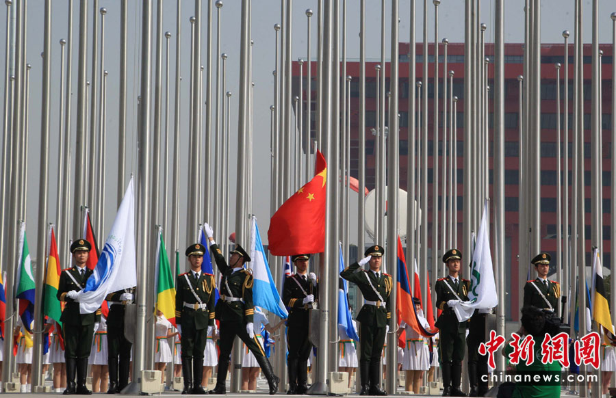4月30日晚,舉世矚目的上海世博會開幕式將在黃浦江畔世博園區(qū)舉行。圖為上海世博會在世博園區(qū)旗林廣場舉行升旗儀式,200多面旗幟展示了各參展方的風采。中新社發(fā) 潘索菲 攝