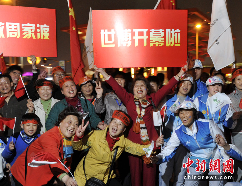 30日晚上8時,2010年上海世博會正式拉開帷幕。上海周家渡動遷居民和志愿者在中國館前打出“世博開幕啦”的大牌子,高喊:“世博開幕啦!我們開心死啦!”中新網記者 王紅綱 攝
