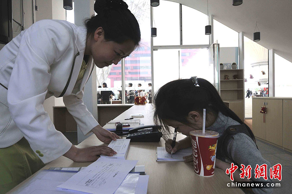 5月2日清晨,7歲的林姝彤小朋友剛跟著伯伯嬸嬸進入上海世博園,就在亂哄哄的人流中走丟了,志愿者把她領到走失兒童認領處。服務小姐在詢問她的姓名等關鍵詞之后,會立即廣播尋人啟示。結果,她很快就和親人團圓了。中新社記者 賈國榮 攝