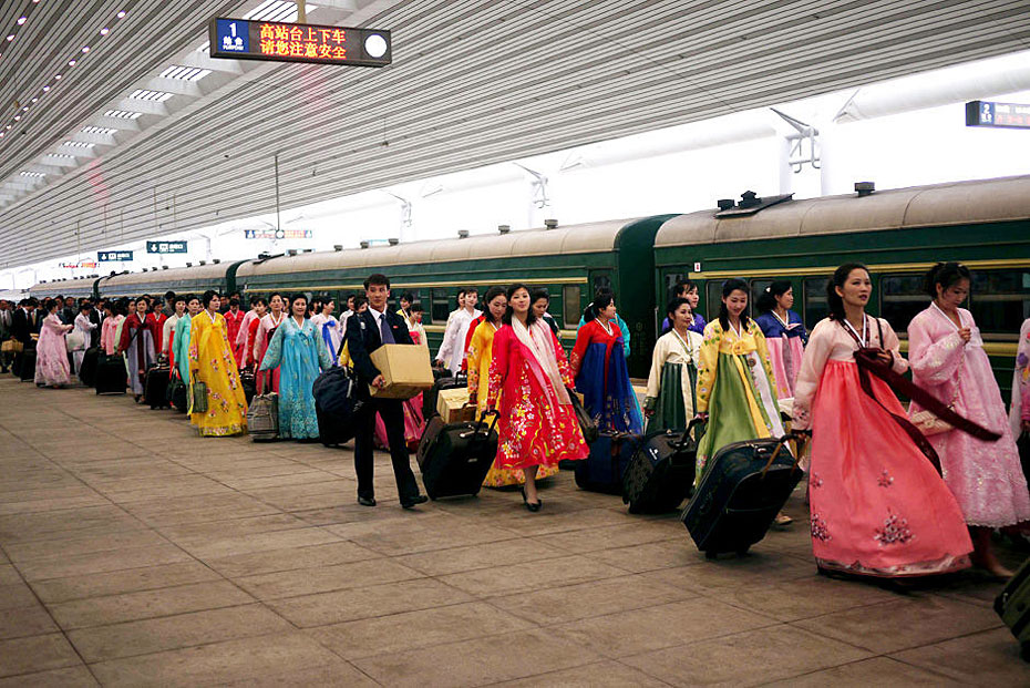 5月2日,載著198名朝鮮紅樓夢劇組演員的專列駛?cè)氲|口岸。由朝鮮國家級藝術(shù)團-血海歌劇團創(chuàng)作的歌舞劇《紅樓夢》將于5月6日至9日登陸北京電視臺大劇院,這個超大演員陣容亦創(chuàng)下近年來華國外演出人數(shù)之最。圖片來源:新華網(wǎng)