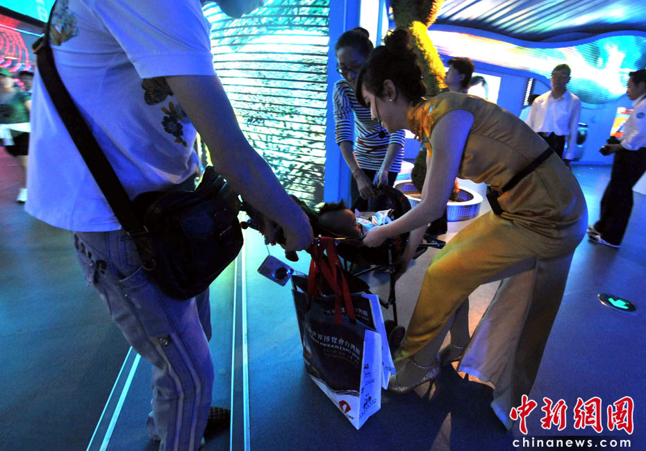 5月3日,上海世博會中國山東館一位禮儀小姐始終笑容可掬,許多參觀者都喜歡與外秀內慧的她拍一張留影照。當一對夫婦推著嬰兒車經過時,她迅速上前幫助抬下階梯。她因而享有全場最善解人意的禮儀小姐美稱。中新社發 賈國榮 攝
