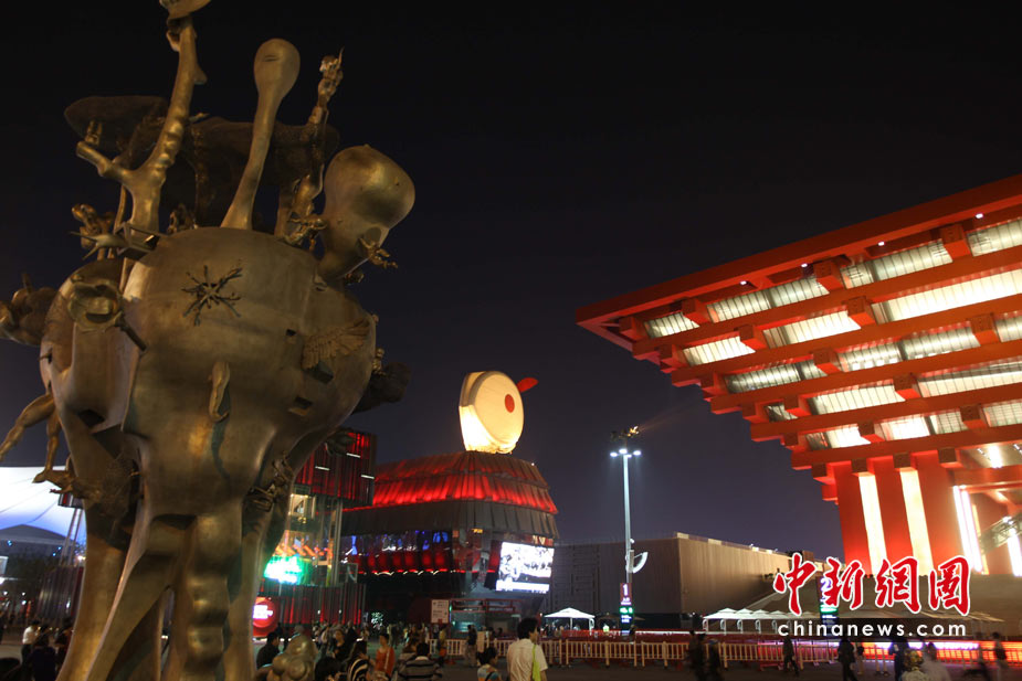 夜幕下的上海世博園區(qū)處處流露光華與璀璨,圖為中國(guó)館與一尊雕塑之間的澳門(mén)館。中新社發(fā) 宗金柱 攝