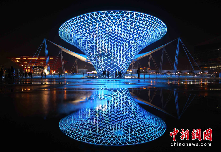 夜幕下的上海世博園區(qū)處處流露光華與璀璨,世博軸上的“陽光谷”成為一個個流光溢彩的“夜光杯”,以不同色調(diào)交織成流動的光影旋律,給游客們帶來難以忘懷的感受。 中新社發(fā) 宗金柱 攝