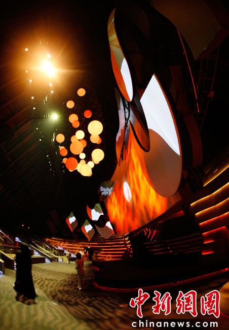 2010年5月4日,上海世博園區迎來首個平日票的參觀客潮。圖為準備好迎接游客的阿聯酋館的影院。中新社發 盛佳鵬 攝