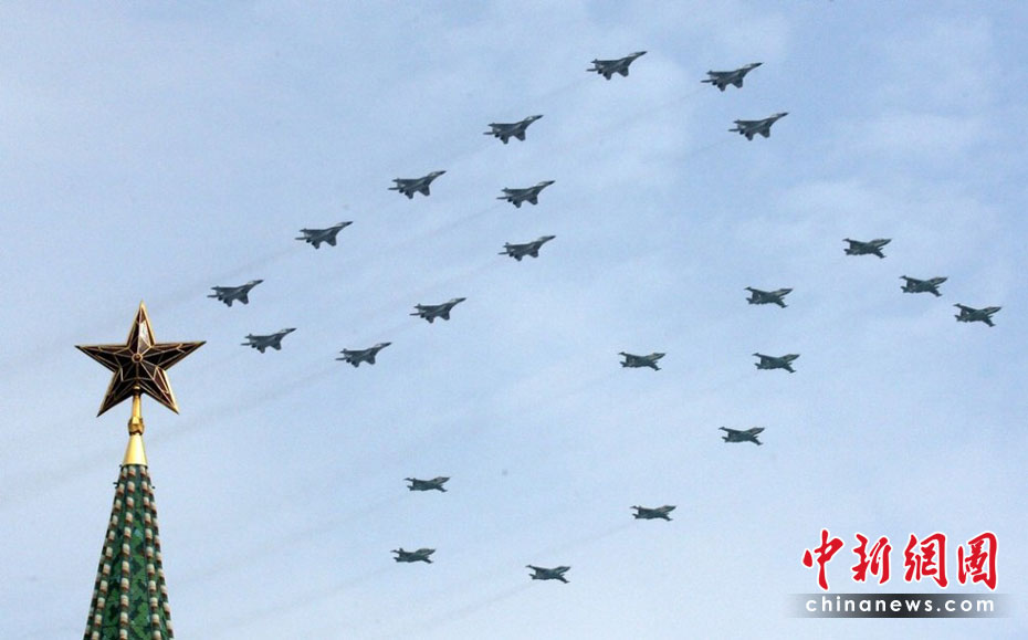 當(dāng)?shù)貢r(shí)間5月4日,在俄羅斯首都莫斯科,參加彩排的戰(zhàn)機(jī)編隊(duì)飛過(guò)紅場(chǎng)上空。俄羅斯將于5月9日隆重紀(jì)念衛(wèi)國(guó)戰(zhàn)爭(zhēng)勝利65周年。圖片來(lái)源:中國(guó)新聞網(wǎng)