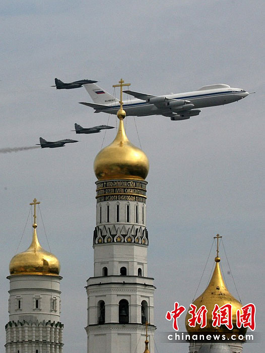 當(dāng)?shù)貢r間5月4日,在俄羅斯首都莫斯科,參加彩排的戰(zhàn)機(jī)編隊飛過紅場上空。俄羅斯將于5月9日隆重紀(jì)念衛(wèi)國戰(zhàn)爭勝利65周年。圖片來源:中國新聞網(wǎng)