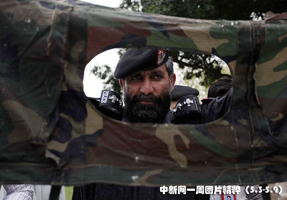 5月6日周四,在巴基斯坦白沙瓦,警察向媒體展示一名自殺式襲擊者的衣物殘骸。當?shù)毓賳T逮捕了兩名據稱發(fā)動了自殺式爆炸的嫌犯。
