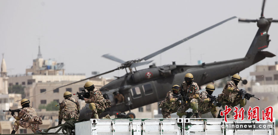 5月11日,約旦特種部隊在安曼空軍基地附近舉行演習,為特種作戰(zhàn)部隊展覽會(SOFEX)開幕式助興。該展覽會為期4天,展覽主題包括國家安全及反恐措施。圖片來源:中國新聞網