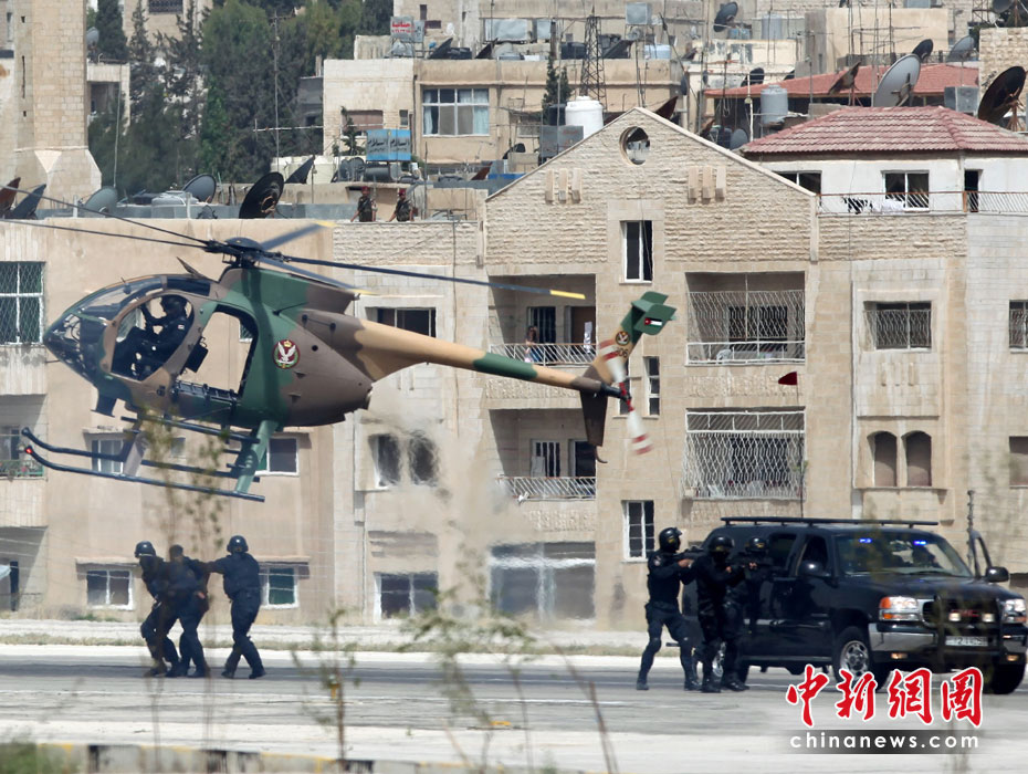 5月11日,約旦特種部隊在安曼空軍基地附近舉行演習,為特種作戰部隊展覽會(SOFEX)開幕式助興。該展覽會為期4天,展覽主題包括國家安全及反恐措施。圖片來源:中國新聞網