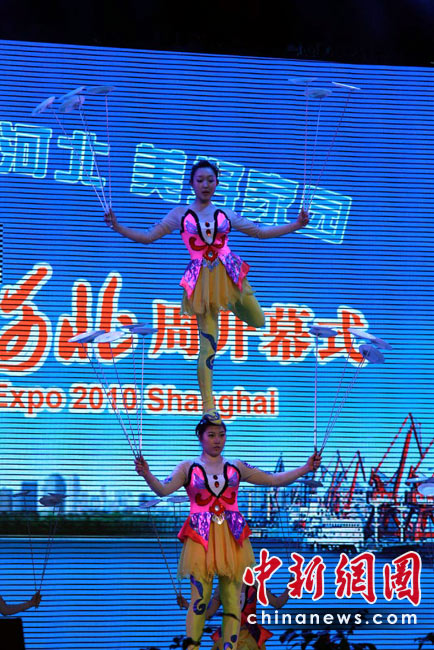 5月14日,上海世博會(huì)“河北活動(dòng)周”在寶鋼大舞臺(tái)啟幕,戰(zhàn)鼓、旱船、拉花、草編、石雕、年畫(huà)、雜技、皮影戲……燕趙大地的傳統(tǒng)絕活一一登場(chǎng)。“河北活動(dòng)周”自14日持續(xù)至18日,將圍繞“京畿神韻”的主線,向世界展示河北省的經(jīng)濟(jì)和藝術(shù)魅力,是繼直轄市北京、天津之后,第一個(gè)由省份在世博會(huì)上舉辦的活動(dòng)周。中新社記者 殷春永 攝