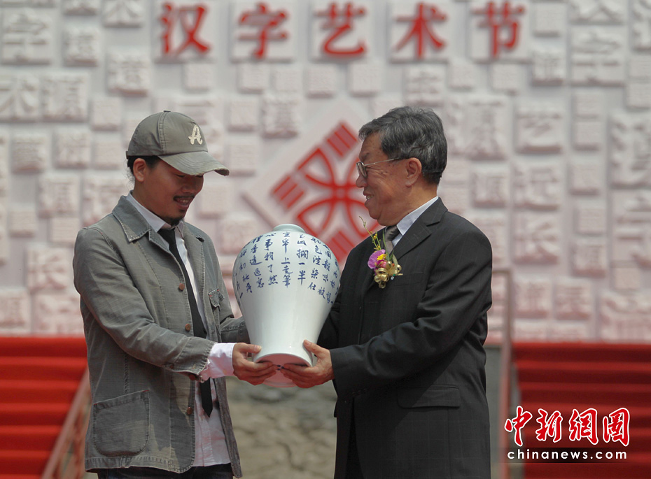 5月15日,首屆“兩岸漢字藝術節”新聞發布會在北京孔廟舉行。原文化部長、著名作家王蒙與臺灣文化總會會長劉兆玄等共同書寫漢字——“漢字藝術源遠流長”。 中新社發 蘇丹 攝