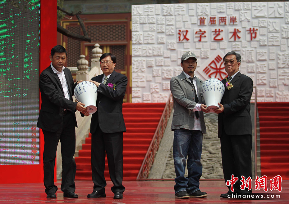 5月15日,首屆“兩岸漢字藝術節”新聞發布會在北京孔廟舉行。原文化部長、著名作家王蒙與臺灣文化總會會長劉兆玄等共同書寫漢字——“漢字藝術源遠流長”。 中新社發 蘇丹 攝