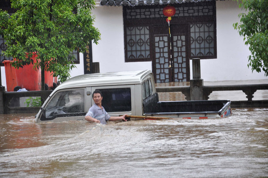 2010年5月18日,江西婺源遭受暴雨洪澇災害,在婺源縣城,一輛汽車和車主被洪水圍困。單長華 攝 (圖片來源:新華網(wǎng))