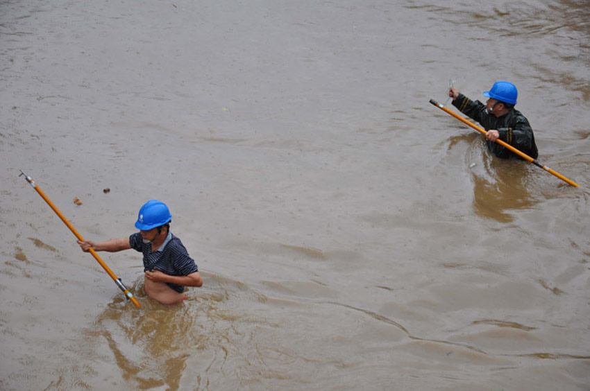 5月18日,婺源縣兩名電力工人走在齊腰深的洪水中。單長華 攝 (圖片來源:新華網)