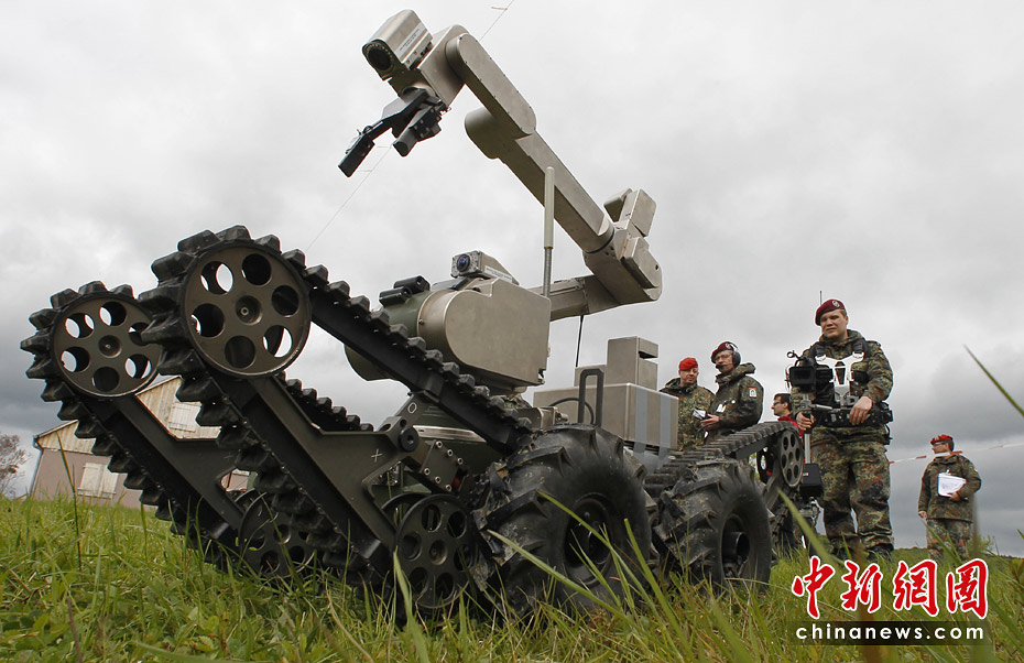 當(dāng)?shù)貢r(shí)間5月18日,德國(guó)南部哈默爾堡舉行了歐洲軍用機(jī)器人大賽。歐洲各國(guó)軍用機(jī)器人在大賽上一展身手。圖片來源:中國(guó)新聞網(wǎng)