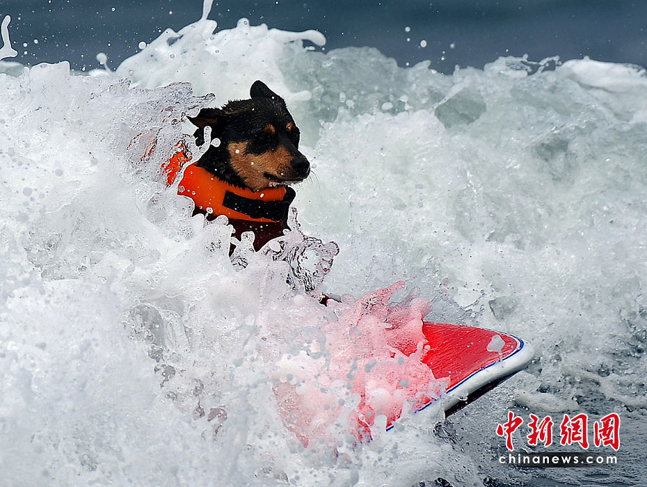 5月22日,美國加利福尼亞州圣迭戈舉行了一場妙趣橫生的狗狗沖浪比賽。圖片來源:中國新聞網