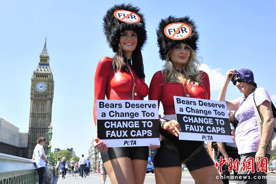 5月24日,倫敦,兩位打扮成英國女王守衛模樣的靚模在威斯敏斯特大橋上抗議女王守衛頭戴熊皮制作的帽子,倡議保護動物。