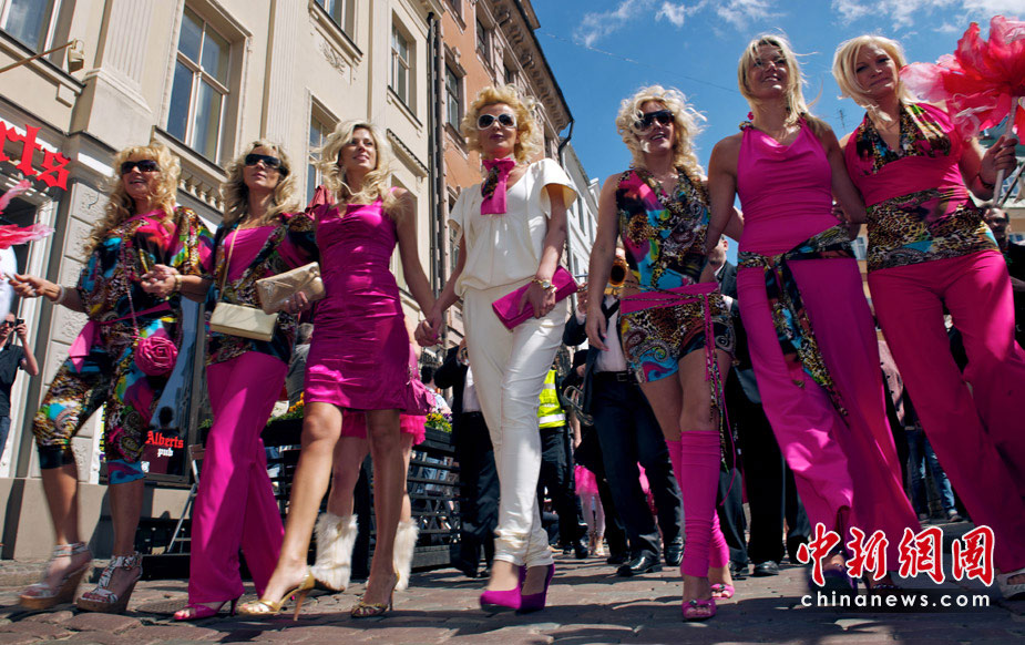 5月29日,在拉脫維亞首都里加,眾多金發美女身著艷麗裝扮在街頭游行,大秀嫵媚身材。
