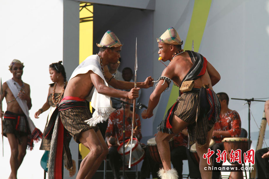 5月30日,馬達加斯加肯特思米諾歌舞團在世博園非洲廣場表演比洛傳統儀式,逼真的神態、激情的表演,博得許多參觀者稱贊。當天是馬達加斯加館日,世博中心內舉行了其國家館日活動,馬方和中方代表共同出席。中新社記者 殷春永 攝