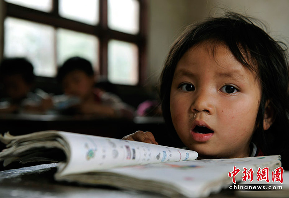 貴州省黔南州惠水縣楊茂村房前小學。一名年僅4歲就被送往學校讀書的一年級留守苗族娃娃。彭年/CFP
