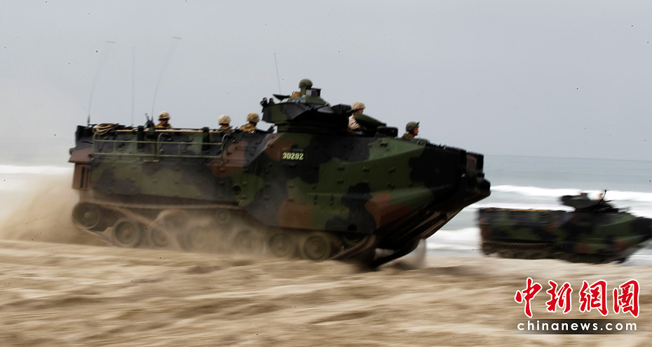當地時間6月4日,約5000名水兵和陸戰隊員在美國加利福尼亞州舉行了代號為“黎明突擊”的搶灘登陸軍事演習。圖片來源:中國新聞網