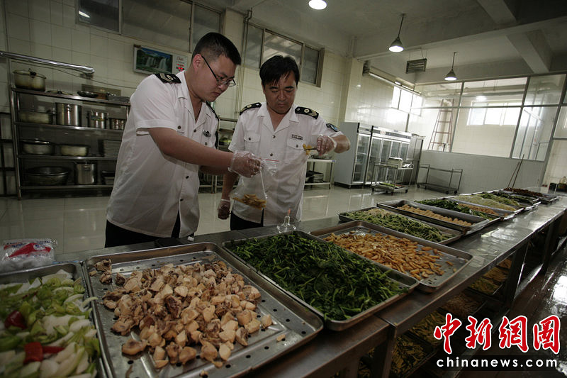 2010年6月4日,山東省濰坊市衛生系統的工作人員檢查濰坊城區的高考考點食堂,為高考“保駕護航”。對此,高新區衛生局購置了針對農殘、亞硝酸鹽、重金屬等快速檢測的食品安全快速檢測設備,確保考生飲食安全。孫樹寶/CFP