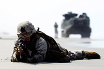6月5日,諾曼底登陸66周年前夕,一批演員身著二戰(zhàn)時期美軍軍服,在法國諾曼底卡倫坦重現(xiàn)了這次著名的戰(zhàn)役。