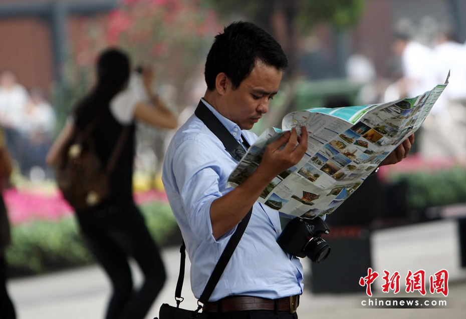 截至6月5日19點30分,上海世博會累計參觀者已超過1000萬人次。據(jù)悉,上海世博會的規(guī)劃用地為5.28平方公里,約242個國家和國際組織參展分布在浦東和浦西兩大區(qū)域。要想在這么大的地方找到自己想去的地方,那么世博地圖就是必須的裝備。圖為上海世博園內游客正在地圖上尋找自己要去的地方。中新社記者 杜洋 攝