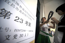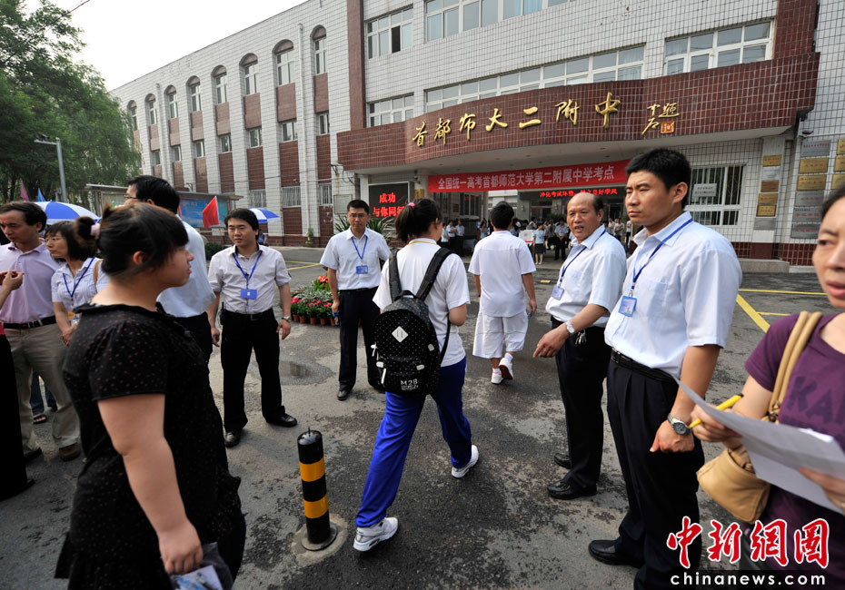2010年全國高考6月7日日拉開大幕,957萬考生走進考場。由于報名人數減少,而招生計劃增加,教育部預計今年全國高考平均錄取率將會增加近7%。圖為首都師范大學第二附屬中學考點。中新網記者 金碩 攝